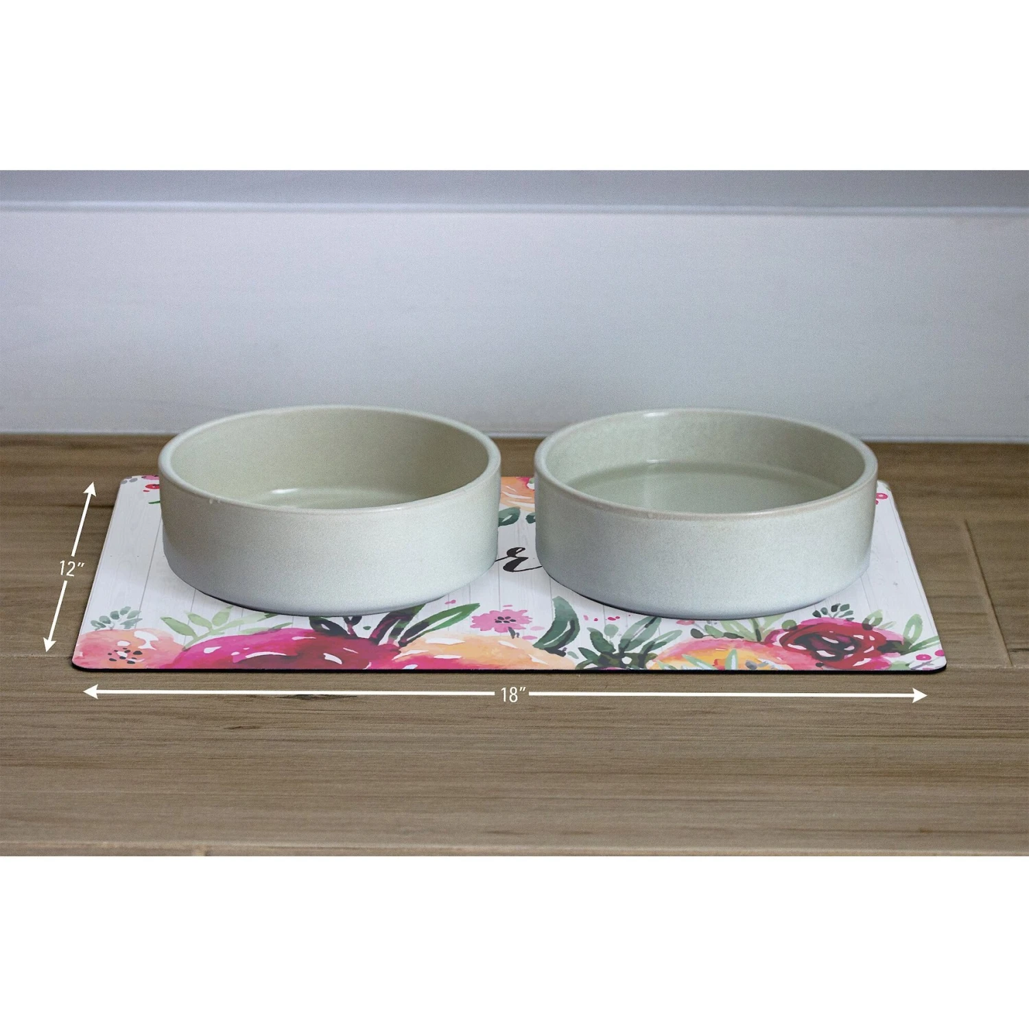 - 12 x 18 inch waterproof mat can hold 2 bowls.