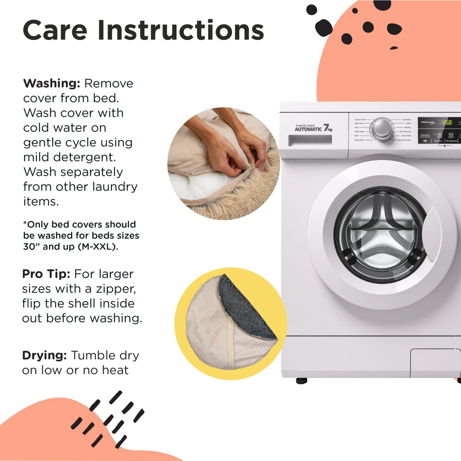 - Machine wash the entire bed on gentle cycle and dry on low or no heat; see pro tips for more details.
