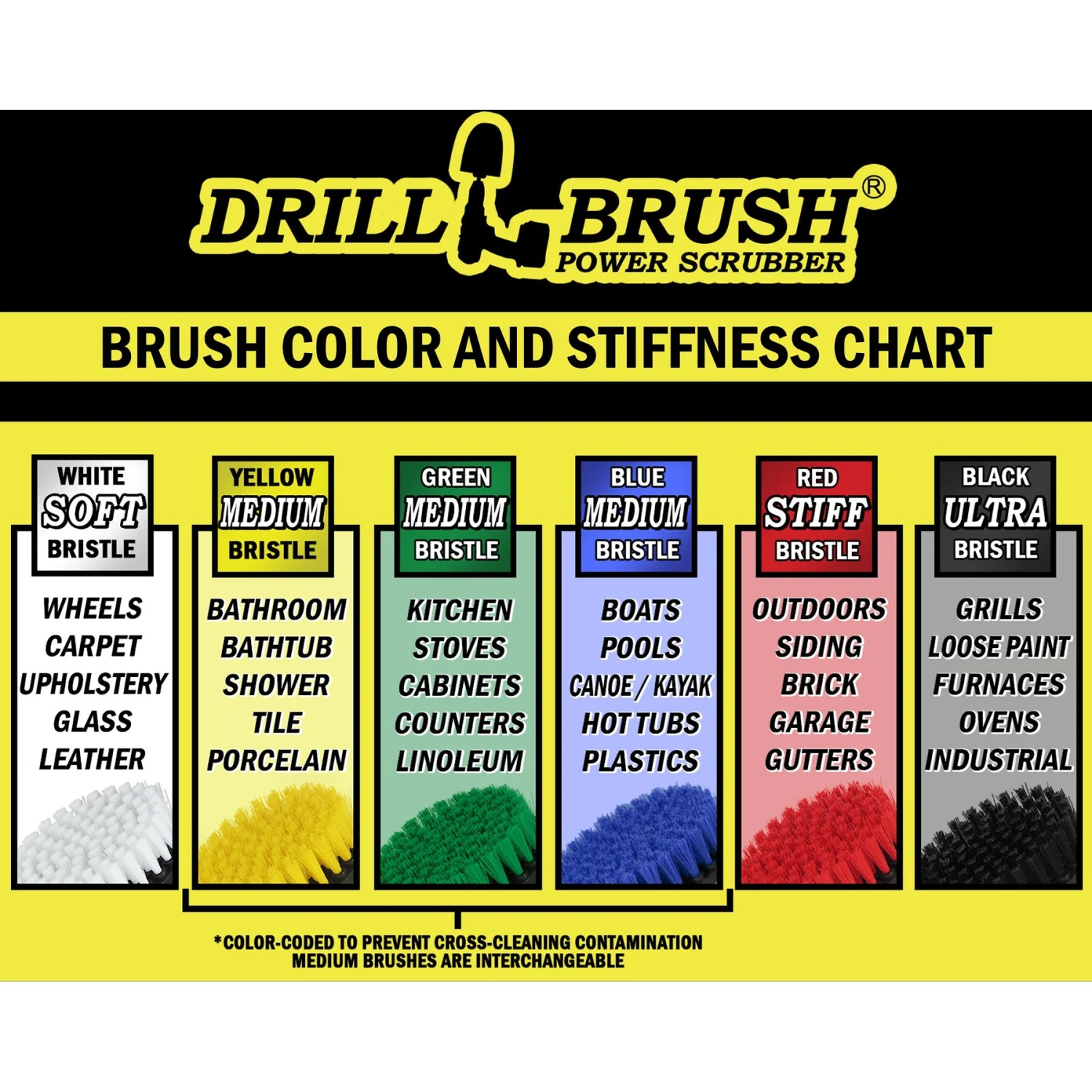 - This kit includes 4 different sizes of medium stiffness power scrubber brush heads that attach to your cordless drill.