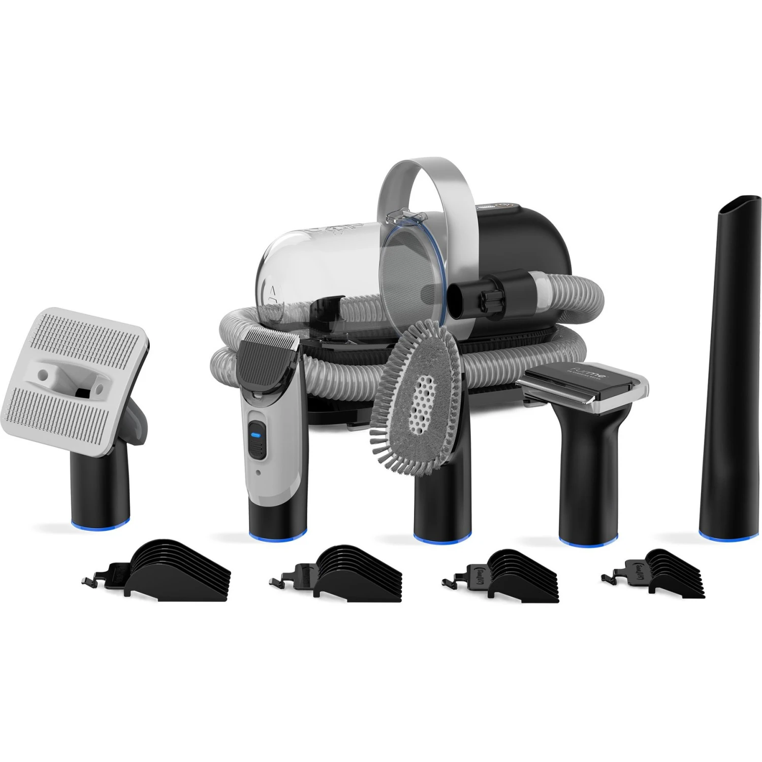 - All-in-one professional pet grooming kit includes a grooming brush, a de-shedding brush, a crevice cleaning head, a cleaning brush, and electric clippers with 6 mm, 12 mm, 18 mm and 24 mm guards.
