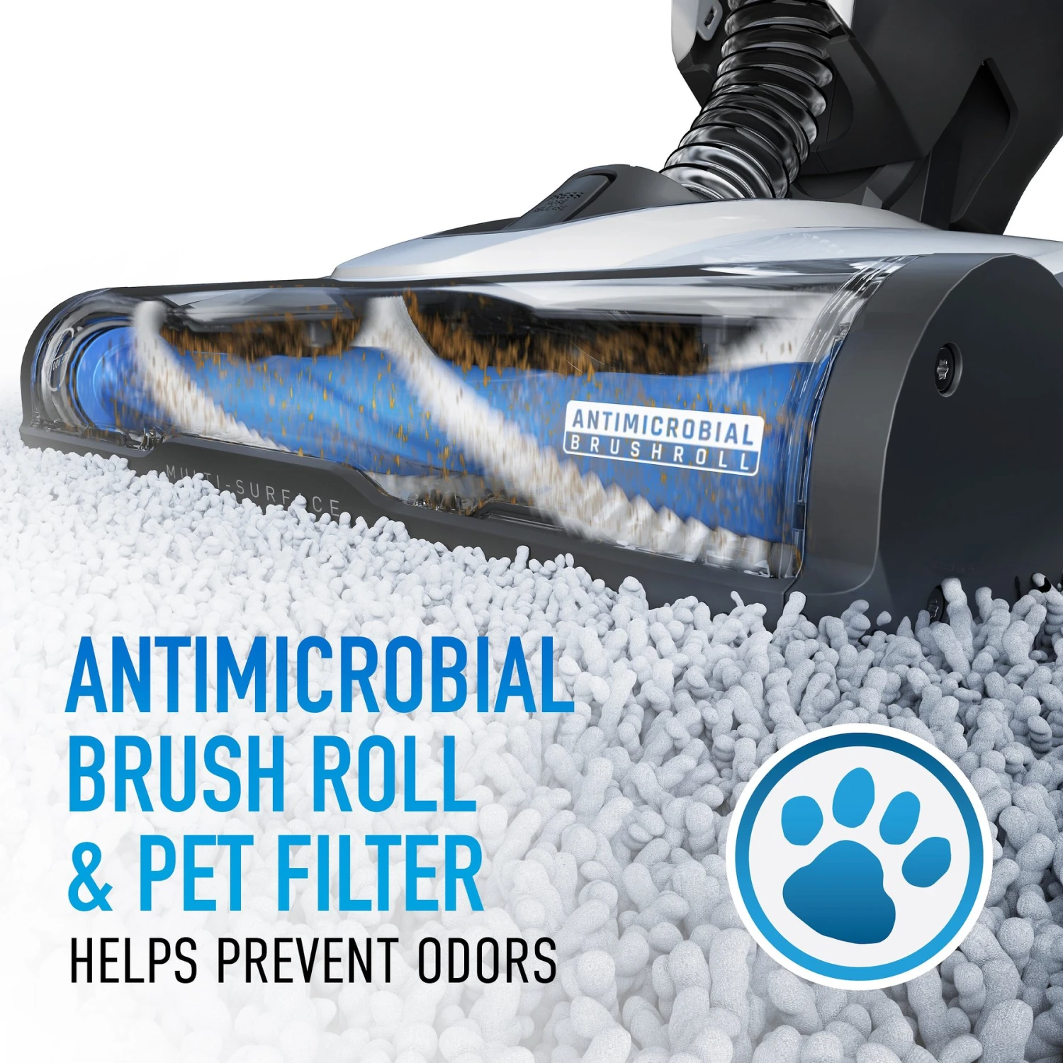 - Antimicrobial brush roll and pet filter protect your vacuum from odor causing bacteria.