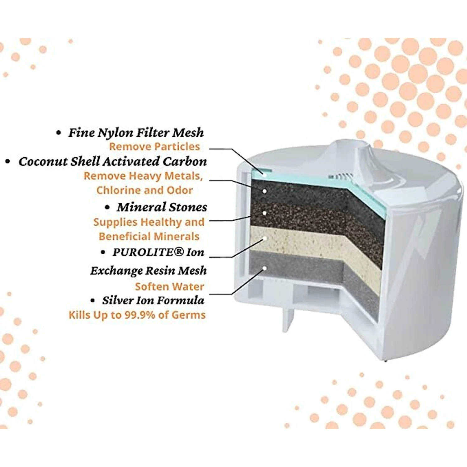 - The second layer—a coconut shell, activated carbon filter—removes chlorine, heavy metals, and odors.