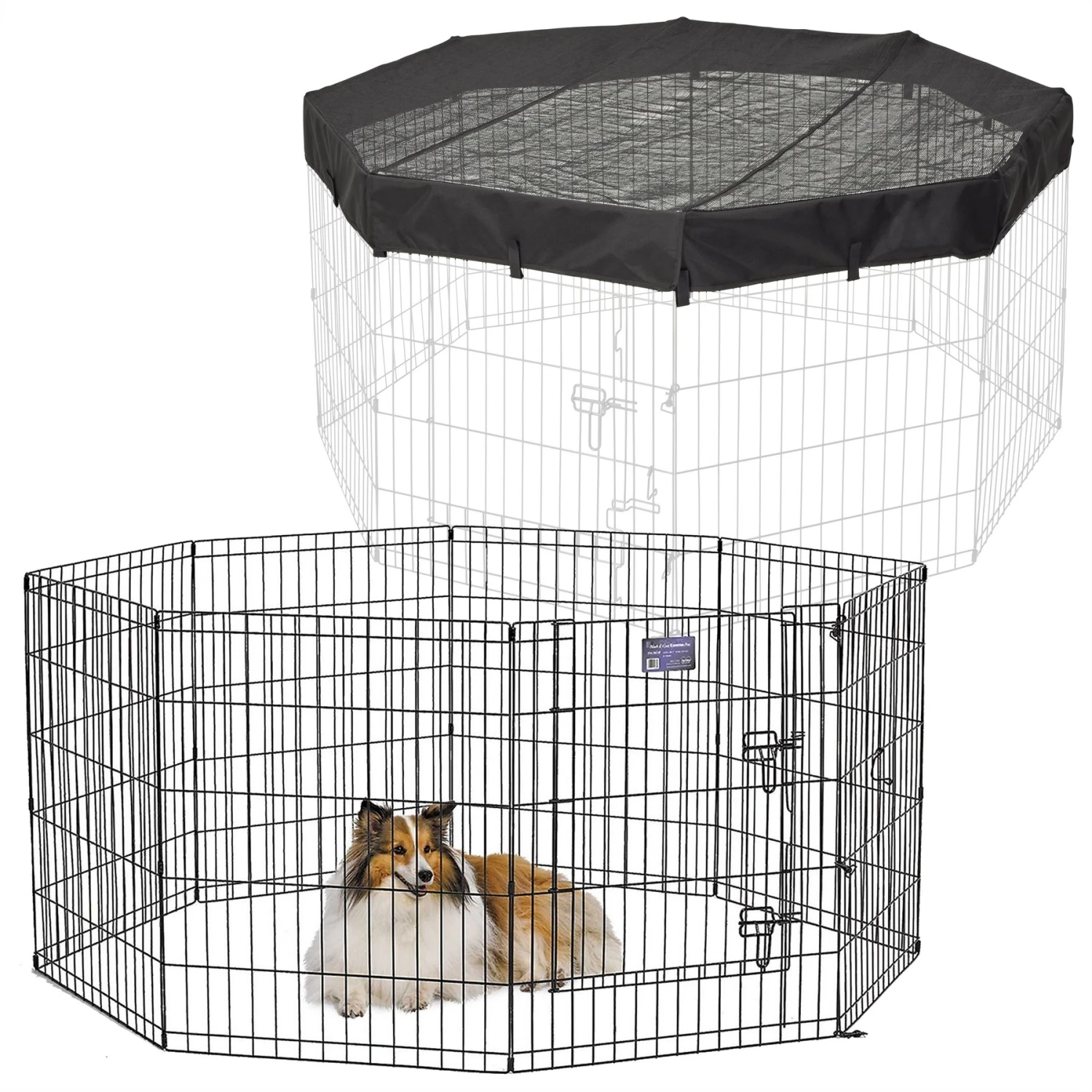 MidWest Wire Dog Exercise Pen With Step-Thru Door, Black E-Coat & MidWest Exercise Pen Top Fabric Mesh Sunscreen Accessory, Octagonal Configuration, Black