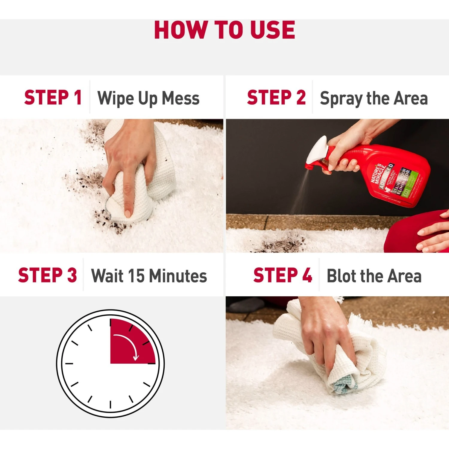 - Targets severe dog messes including urine, diarrhea, vomit and blood.