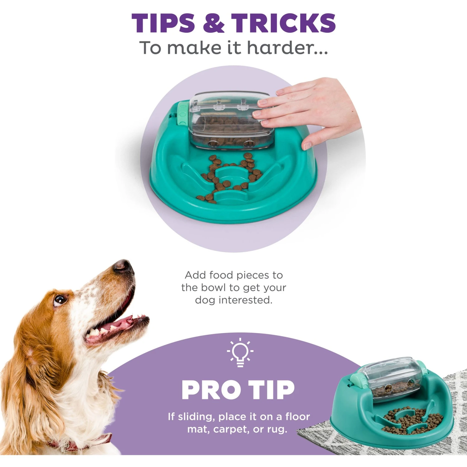 - Your pal spins the barrel to dispense food into his slow feeder dog bowl–holds 2 cups of dog treats or kibble.
