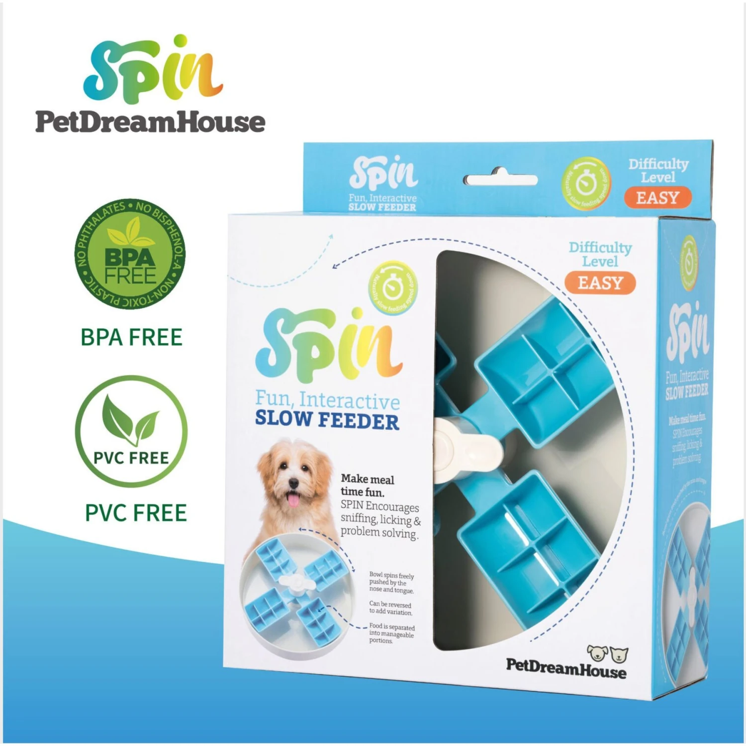 Pet Dream House SPIN Interactive Windmill Style Easy Level Slow Feeder Dog Bowl, Blue