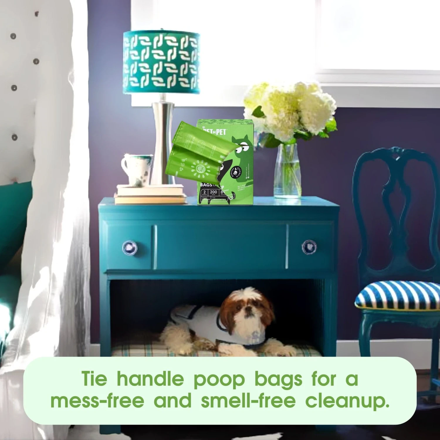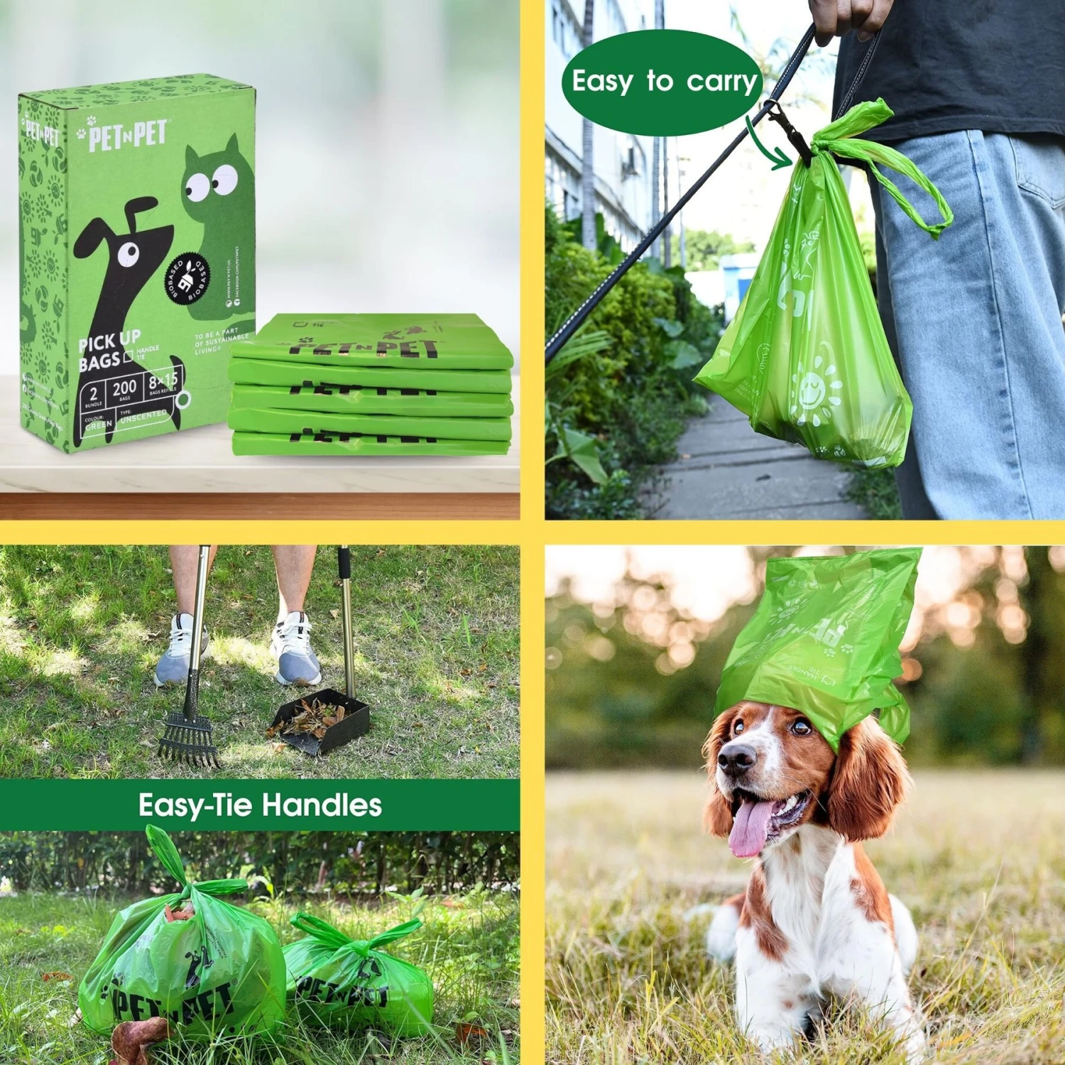 - Box comes with 200 premium waste bags that have extra-long tie handles.