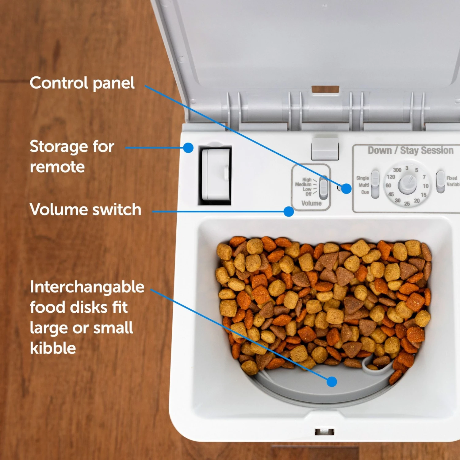 - Dispenses kibble or treats up to thirty yards away with the remote.