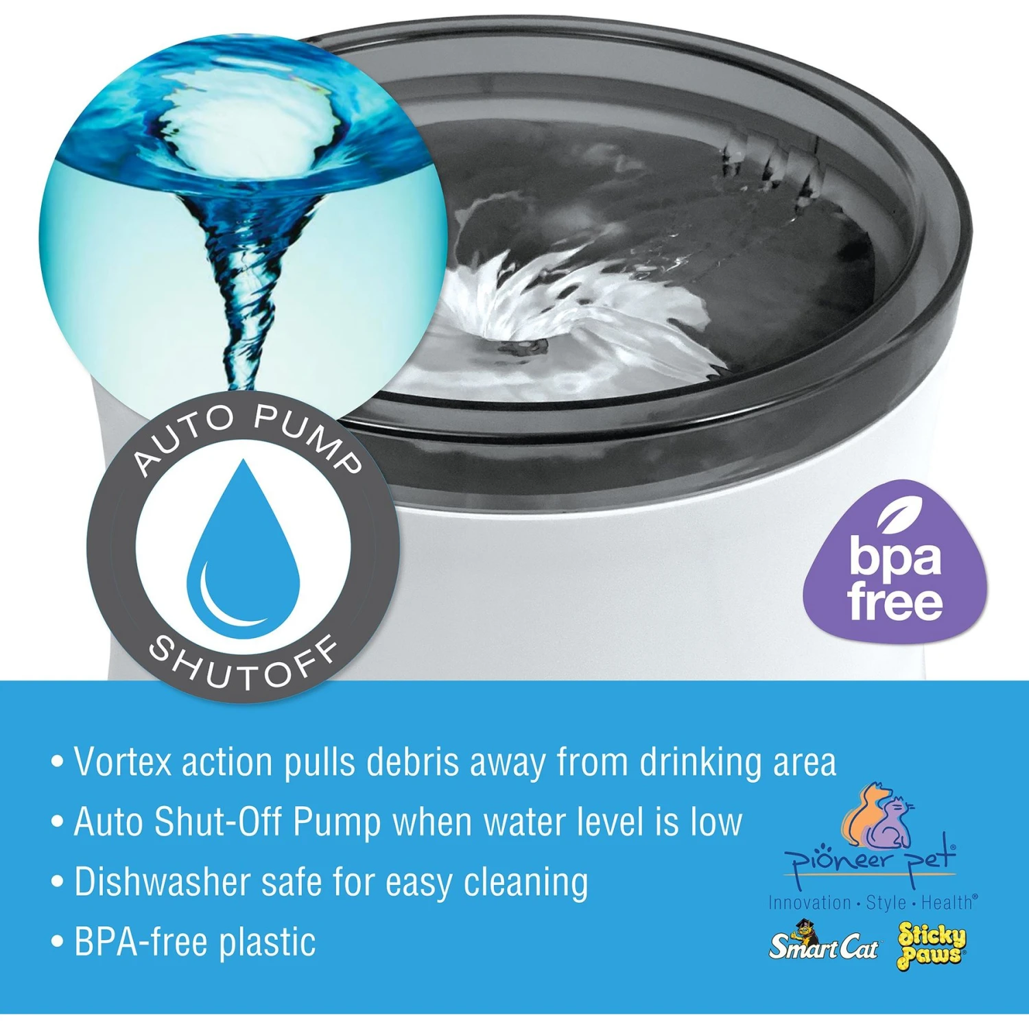 - Cat and dog water fountain uses vortex action to pull debris away from your pet’s drinking area.