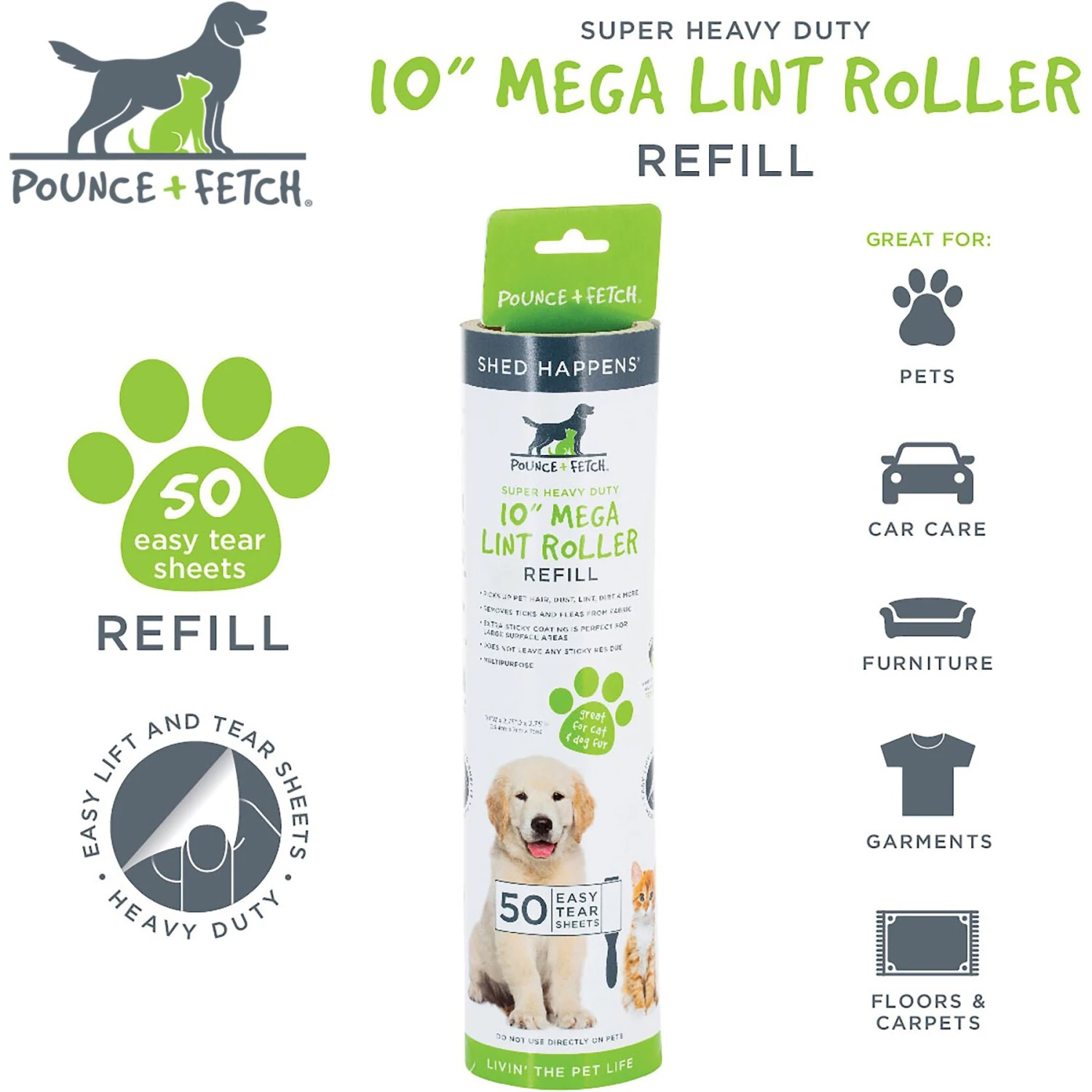 - Compatible with the Pounce & Fetch Mega Lint Roller (sold separately).