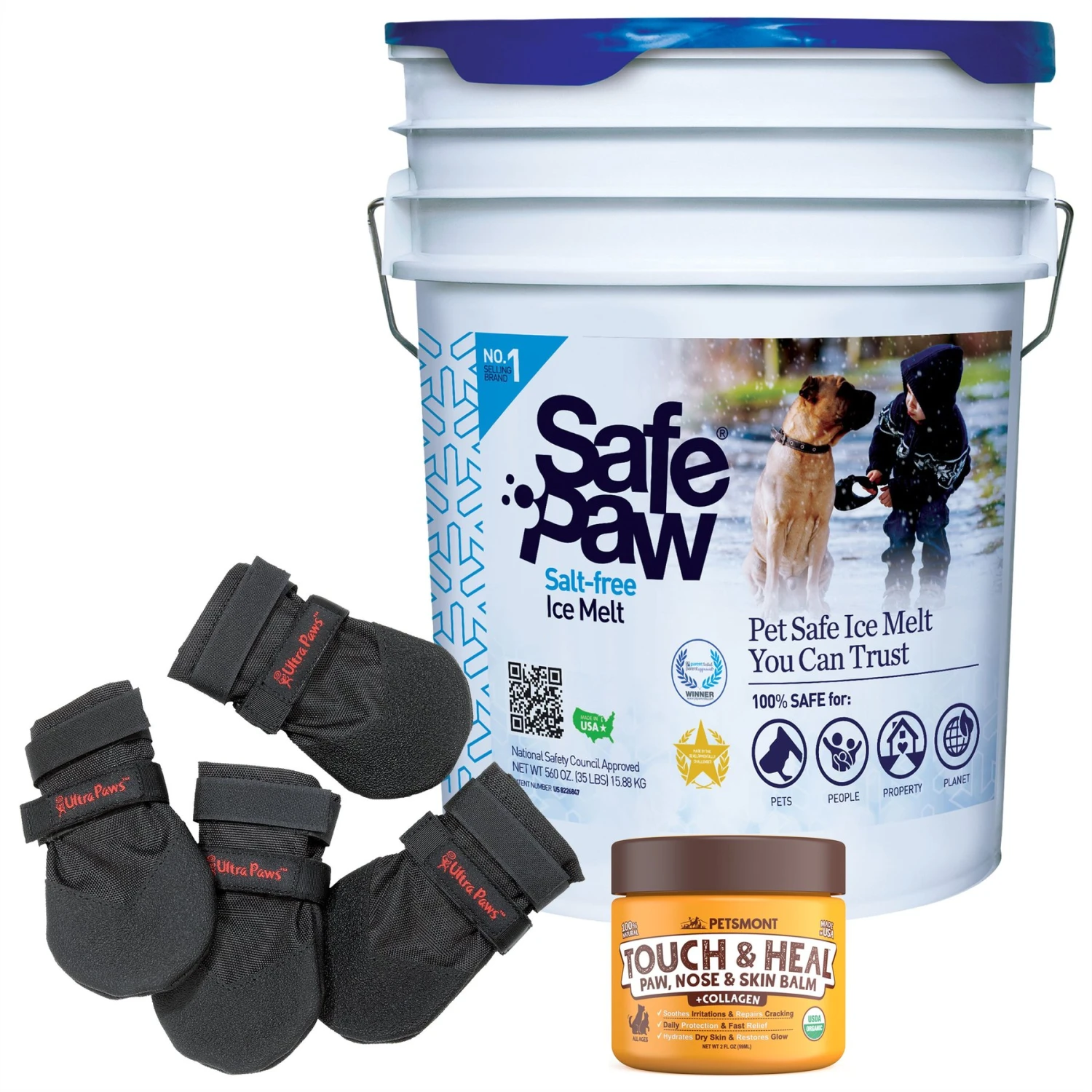 Safe Paw PetSafe Ice Melt for Dogs & Cats, 35-lb pail — Safe Paw PetSafe Ice Melt for Dogs & Cats offers an innovative way to clear your driveways and sidewalks of winter snow and ice. While most ice melters contain salt, which can harm pets, humans, and the environment, Safe Paw is completely salt-free and recommended by veterinarians. It uses a patented, dual-effect compound that works with a two-way timed-released action. First, it starts melting the ice instantly while breaking up the surface tension, and then it penetrates and destabilizes the ice to speed up melting—all while offering slip protection with a proprietary traction agent.